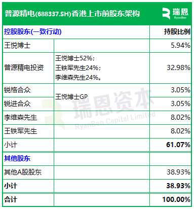 王悦博士直接持股5.94%,通过拥有52%的普源精电投资持股32.98%,控制的锐格合众、锐进合众分别持股3.05%、3.05%,合计持股约44.97%。与王悦博士一致行动人士王铁军先生、李维森先生分别持股8.02%、8.02%。前述股东合计持股61.07%,为控股股东集团。
