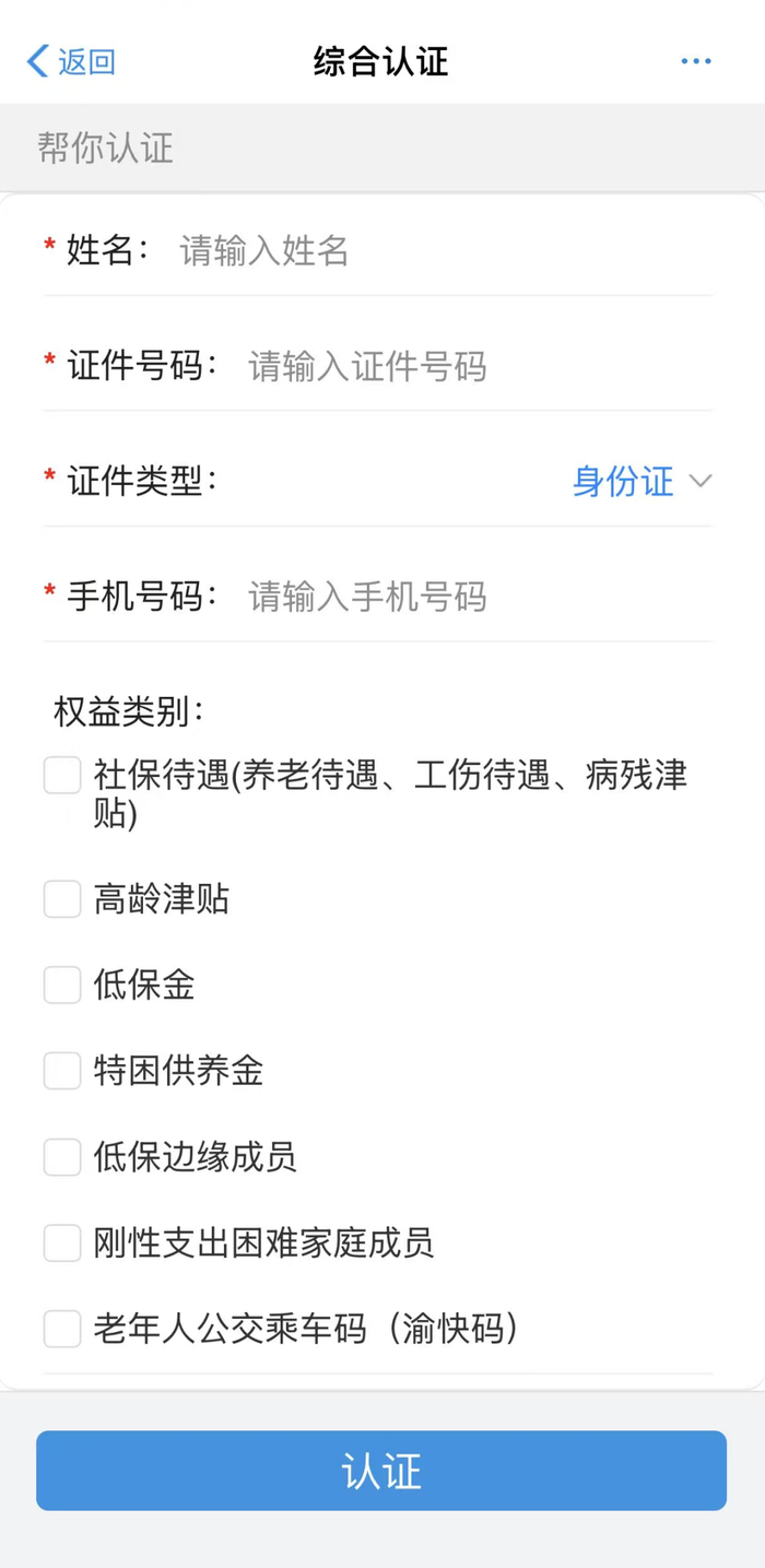 同样在“渝快办”APP搜索“居民待遇权益资格综合认证”功能模块,选择【帮你认】,输入认证人的身份信息并选择相关待遇权益事项,进行人脸识别后,即可完成认证。