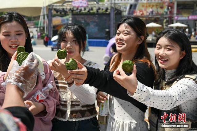 4月4日,清明节将至,重庆涪陵红酒小镇推出“麻将”青团、“象棋”青团等多种清明特色食品,吸引游客前来免费品尝,一起感受清明传统文化。图为游客品尝青团。中新社记者 何蓬磊 摄