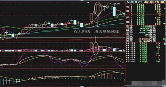 4、 股价创新高收大阳K线,但成交量锐减。股价于当天反复震荡盘升创出新高,并收盘于最高价附近,当天的K线以大阳线报收。但成交量相对前一个交易日明显萎缩,说明当天的上涨主要由主力在盘中对敲完成,而实际情况却是在盘中悄悄出货,股价攻克乏力,即将见顶回落。此时,应于次日及时果断卖出。
