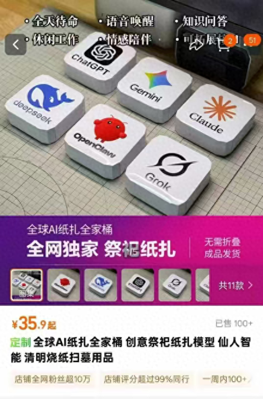 电商商家将deepseek、chatgpt、gemini、openclaw等热门的AI应用工具的图标印刷到了纸扎上,售价不算便宜,一个要35元,全家桶要209元,纸扎的AI算力卡在今年的赛博祭扫中热度也很高,卡面上写着"16GB超大显存""AI全算力加速""地府专属无上限算力",除了AI智能应用外,这几年开始流行起来的具身智能机器人、扫地机器人、ps5游戏机也都有纸扎祭品版,有网友开玩笑说“阴间也是在与时俱进”。