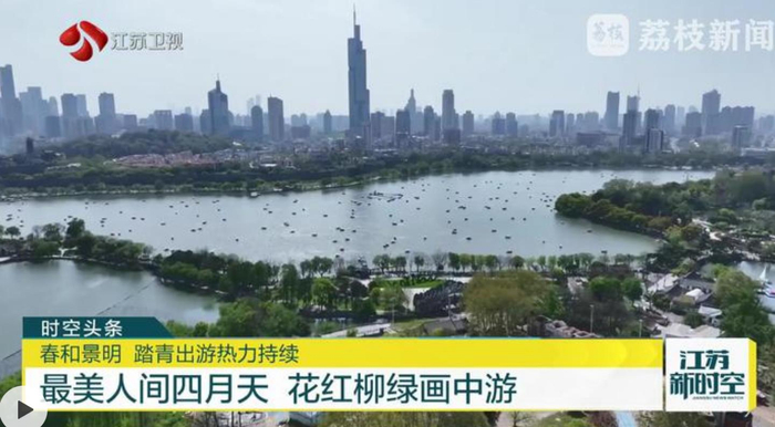 荔枝新闻中心记者范洁萍说:“这里是南京市玄武湖景区,清明假期,很多游客来这里踏青赏花,享受一份假期的松弛感。人气有多高呢?在不远处的玄武湖游船码头上,此刻一艘游船都没有了。目前,景区近600条观光游船全部都在湖面上。”
