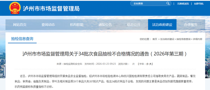 四川省泸州市市场监督管理局关于34批次食品抽检不合格情况的通告(2026年第三期)