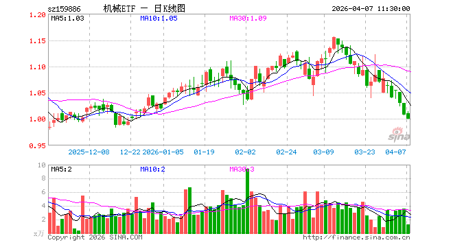 4月7日,截止午间收盘,机械ETF富国(159886)跌0.79%,报1.000元,成交额130.44万元。机械ETF富国(159886)重仓股方面,宁德时代截止午盘跌1.08%,阳光电源跌0.80%,中国船舶涨4.56%,汇川技术跌1.68%,三一重工跌1.96%,特变电工跌0.63%,隆基绿能跌0.84%,徐工机械跌2.35%,思源电气跌5.30%,潍柴动力跌4.94%。