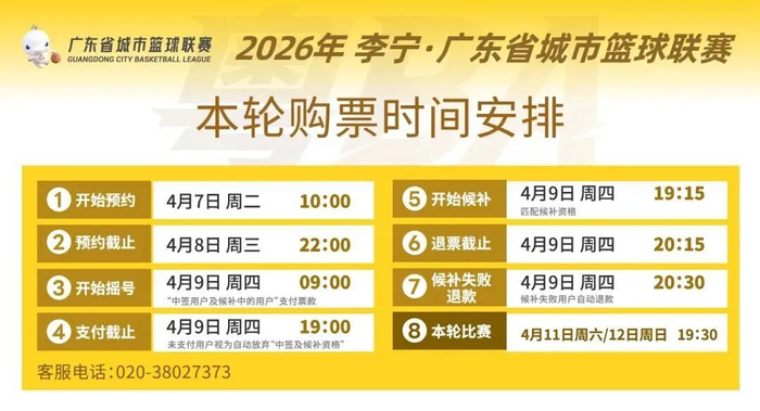 4月11日(周六),9场对决将率先打响,其中深圳与惠州的比赛调整至4月12日(周日)进行。常规赛第三轮所有场次票价统一为8.8元。票务预约系统将于4月7日(周二)上午10:00正式开放,截止时间为4月8日(周三)22:00。