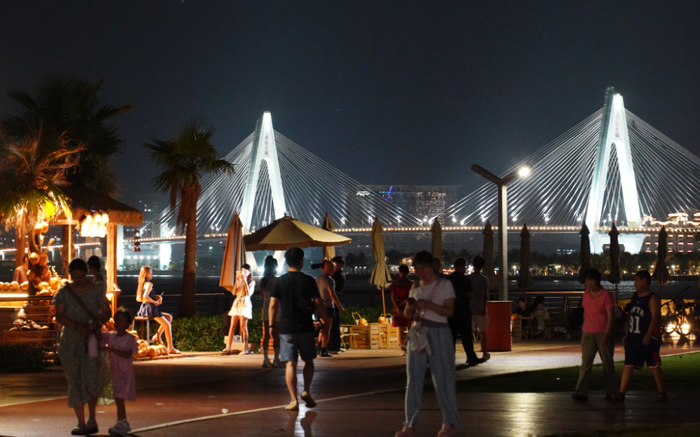海口FUNBAY自在湾街区以潮流时尚氛围圈粉年轻人,多巴胺彩绘道路、网红打卡墙成为拍照热点,游客面朝大海享受美食与落日,点亮椰城时尚夜生活。