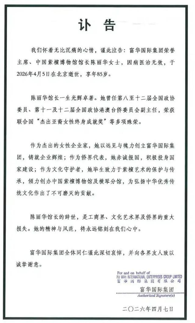 4月7日,富华国际集团发布讣告,富华国际集团荣誉主席、中国紫檀博物馆馆长陈丽华女士,因病医治无效,于2026年4月5日在北京逝世,享年85岁。