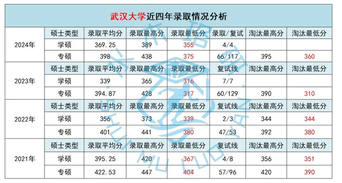 2019-2025专硕分数线为355/375/390/380/310/360,考察数二英二电路858,由于两年制的性价比极高,早年武大专硕的分数线都比较稳定在380左右。