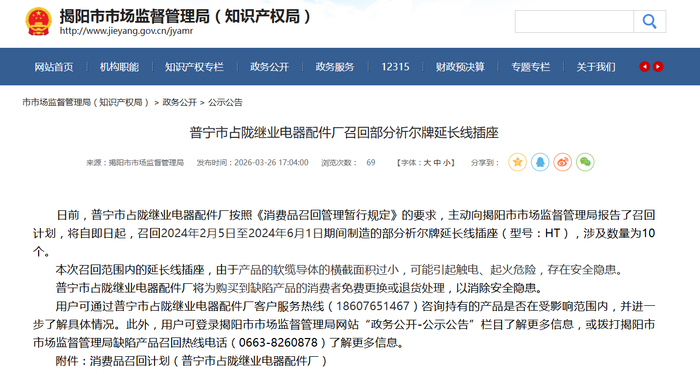 中国质量新闻网讯 据揭阳市市场监管局网站消息,日前,普宁市占陇继业电器配件厂按照《消费品召回管理暂行规定》的要求,主动向揭阳市市场监督管理局报告了召回计划,将自即日起,召回2024年2月5日至2024年6月1日期间制造的部分祈尔牌延长线插座(型号:HT),涉及数量为10个。