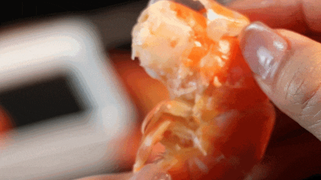 也不废话简单蒸煮一下就是开炫,炫完还不忘评价:“肉质太弹了,比菜市场的鲜虾还好吃”、“肉多,吃起来特别爽”~