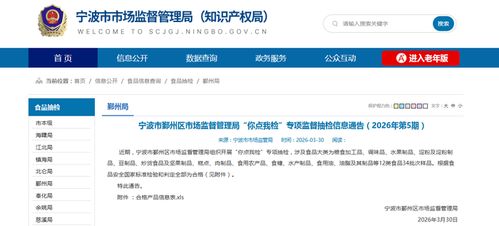 宁波市鄞州区市场监督管理局“你点我检”专项监督抽检信息通告(2026年第5期)