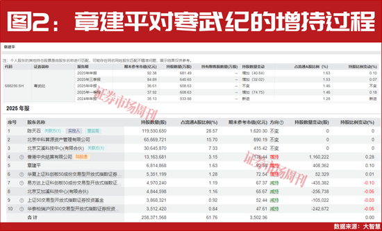 2024年四季度末,章建平首次进入寒武纪前十大股东名单,当时持股533.88万股。随后一路加仓,2025年一季度持仓增至608.63万股;三季度进一步加仓至640.65万股;四季度再度买入40.84万股。截至2025年年末,章建平合计持有681.49万股寒武纪,持仓市值约92.38亿元,占流通股比例1.63%。在自然人股东中,其持股规模仅次于公司董事长陈天石(见图2)。