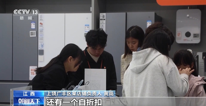 上饶广丰区某店铺负责人 黄岚:这几天差不多每天可以达到三四万元的销售额。我们店铺除了国补以外,还有一个自折扣,同时还有一个家庭套餐优惠。