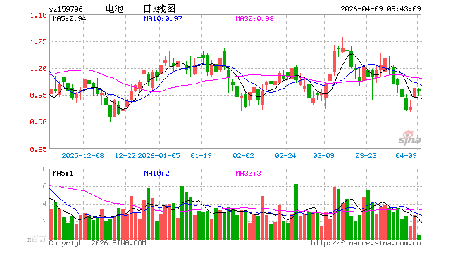 电池ETF汇添富(159796)开盘跌0.10%,重仓股宁德时代涨0.72%,阳光电源跌1.30%