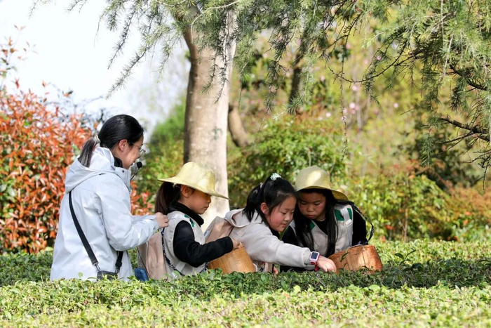 4月1日,安徽省春假第一天。黄山市徽州区谢裕大茶博园内,学生们背着小竹篓,化身小茶农,在专业指导下轻采春茶嫩芽,在茶园里感受自然与非遗的美好。