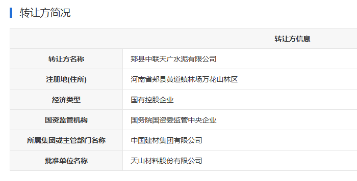 转让方郏县中联天广水泥有限公司为国有控股企业,注册地位于河南省郏县黄道镇林场万山林区,由国务院国资委监管,隶属于中国建材集团有限公司,本次资产转让经天山材料股份有限公司批准实施。