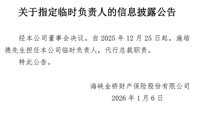 同日,海峡保险的另一则公告提到,经公司董事会决议,自2025年12月25日起,施培德担任公司临时负责人,代行总裁职责。