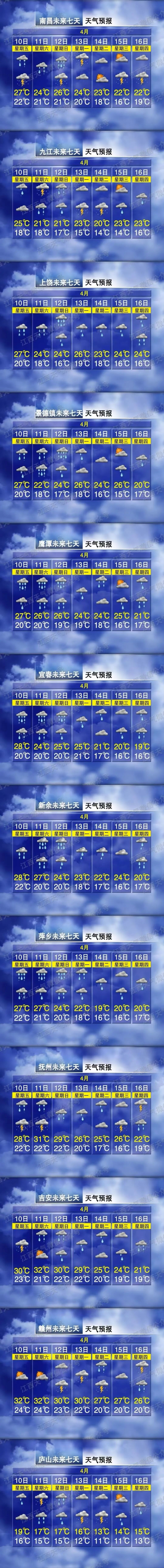 未来一周雨带仍在江南维持,我省多降水过程和强对流天气。9~16日累计雨量赣北赣中80~130毫米,局地超过200毫米;赣南30~80毫米。其中,9~11日赣北赣中部分地区有暴雨和雷暴大风、冰雹等强对流天气,局地将出现10级以上大风;12~13日降水、对流天气有所减弱,赣北赣中局地仍有暴雨;15~16日我省还有一次降水过程。