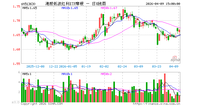 港股低波红利ETF摩根(513630)业绩比较基准为标普港股通低波红利指数收益率,管理人为摩根基金管理(中国)有限公司,基金经理为何智豪、胡迪,成立(2023-11-23)以来回报为68.09%,近一个月回报为-0.53%。