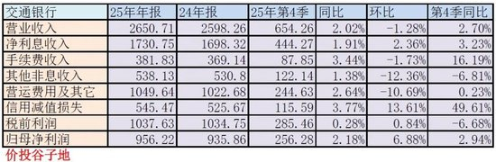 根据2025年年报显示,交通银行营收2650.71亿,同比去年同期增长率为2.02%。其中,净利息收入1730.75亿,同比增长率1.91%。手续费收入381.83亿,同比增长3.44%,归母净利润956.22亿同比增长2.18%。更多的数据参考表1: