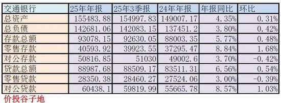 交通银行2025年年报总资产15.55万亿,同比去年增速4.35%。其中贷款总额88987.68亿,同比去年增速6.56%。总负债14.27万亿,同比去年增速3.8%。其中存款总额93078.15亿,同比去年增速5.77%。更多的数据参考表3: