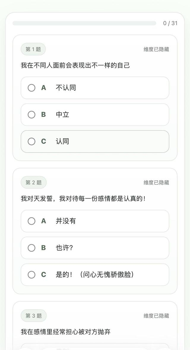 问题包括“我在不同人面前会表现出不一样的自己”“我在感情里经常担心被对方抛弃”“朋友带了ta的朋友一起来玩,你最可能的状态是……而答案则通常包括“认同”“中立“不认同”三个维度。
