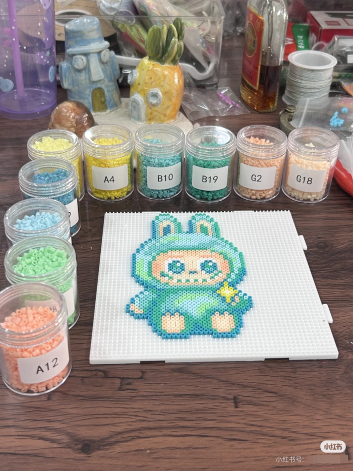 拼豆,是一种彩色塑料豆粒。玩家将豆粒在模板上拼成图案后,用熨斗加热使其融合固定,即可制成挂件、摆件、杯垫等成品。其核心门槛极低——不需要绘画基础,只需按照像素图“按图索豆”;视觉效果好,成品自带复古像素风的潮流感;更重要的是,它强调“沉浸式手工体验”,一颗一颗摆放豆粒的过程本身就被年轻人视为一种解压方式。