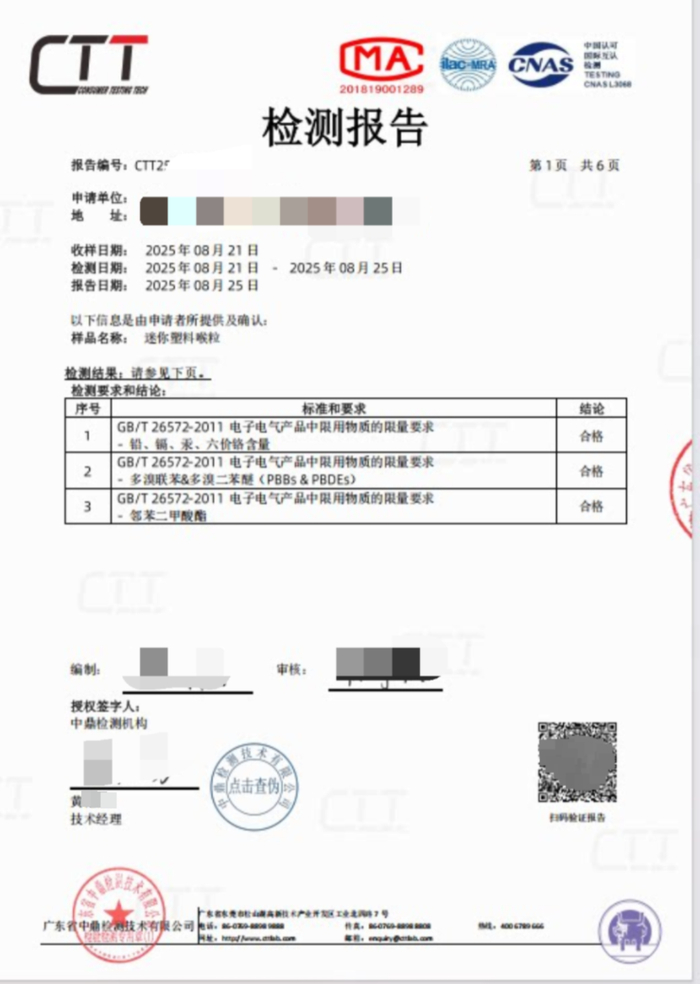记者同样询问了商家关于“甲醛”的问题,客服表示“我们的拼豆采用环保材质,符合安全标准,已通过权威检测认证,甲醛含量未检出”,并出具了检测报告。