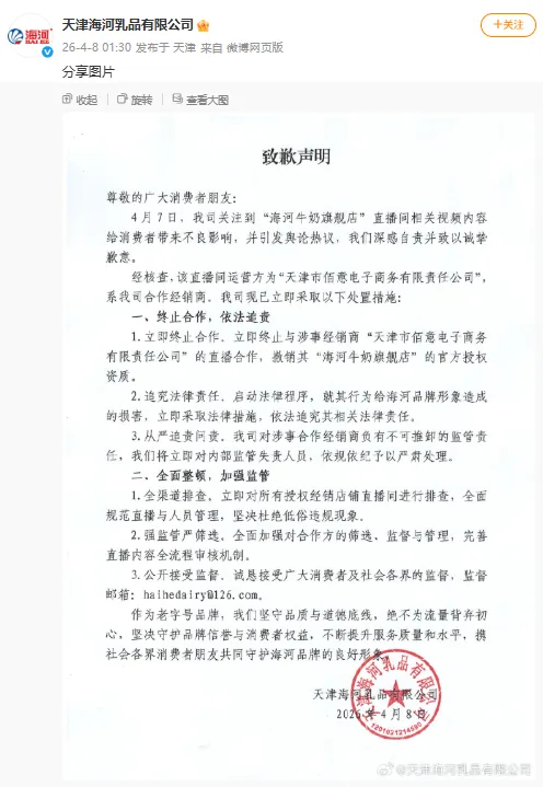 直至4月8日凌晨,天津海河乳品有限公司发布正式致歉声明,称涉事直播间运营方为天津市佰意电子商务有限责任公司,“立即终止与涉事经销商‘天津市佰意电子商务有限责任公司’的直播合作,撤销其‘海河牛奶旗舰店’的官方授权资质。”并表示,将追究其法律责任。同时,声明中提到“我司对涉事合作经销商负有不可推卸的监管责任,我们将立即对内部监管失责人员,依规依纪予以严肃处理。”