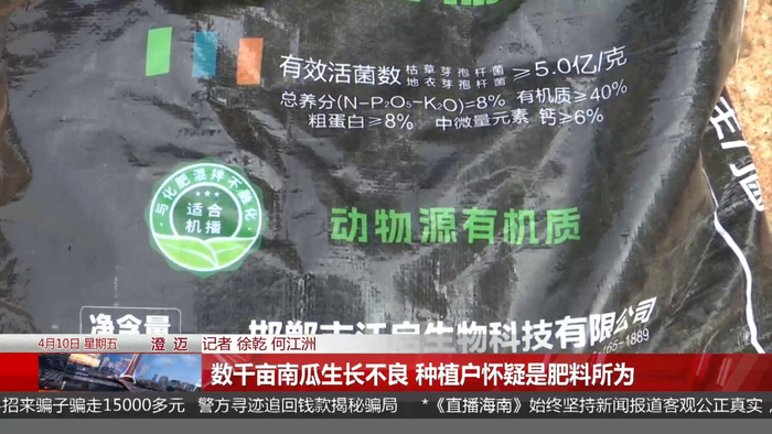 澄迈县农业农村局党组成员全并超介绍,3月25日该局委托省土肥站专家对涉事肥料抽样,种植户、经销商及农业农村局等相关部门均在场见证,样品随后送往北京检测。因检测项目与肥料相关因素匹配度不高,4月1日又将样品转送至武汉检测。