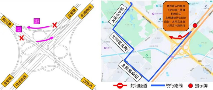 为方便市民提前规划路线,施工期间将在远端关键节点设置醒目绕行提示标志,四环路南向北方向在朝阳公园桥、双新桥、东风北桥布设提示,西向东方向在安慧桥、惠新东桥、望和桥布设提示,提前引导车辆分流。
