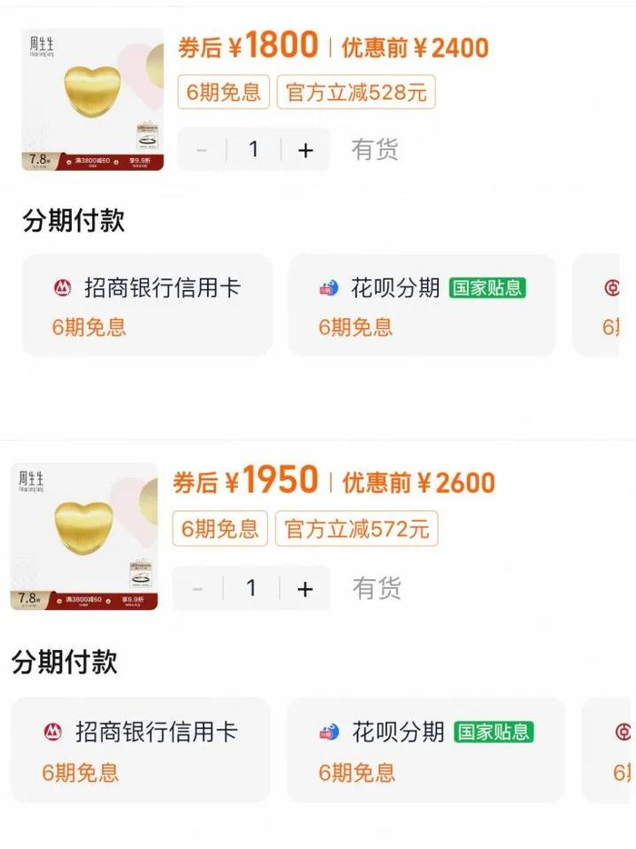 0.7克左右的爱心转运珠,9日原价2600元,券后1950元;10日原价降至2400元,券后1800元,又便宜了150元。