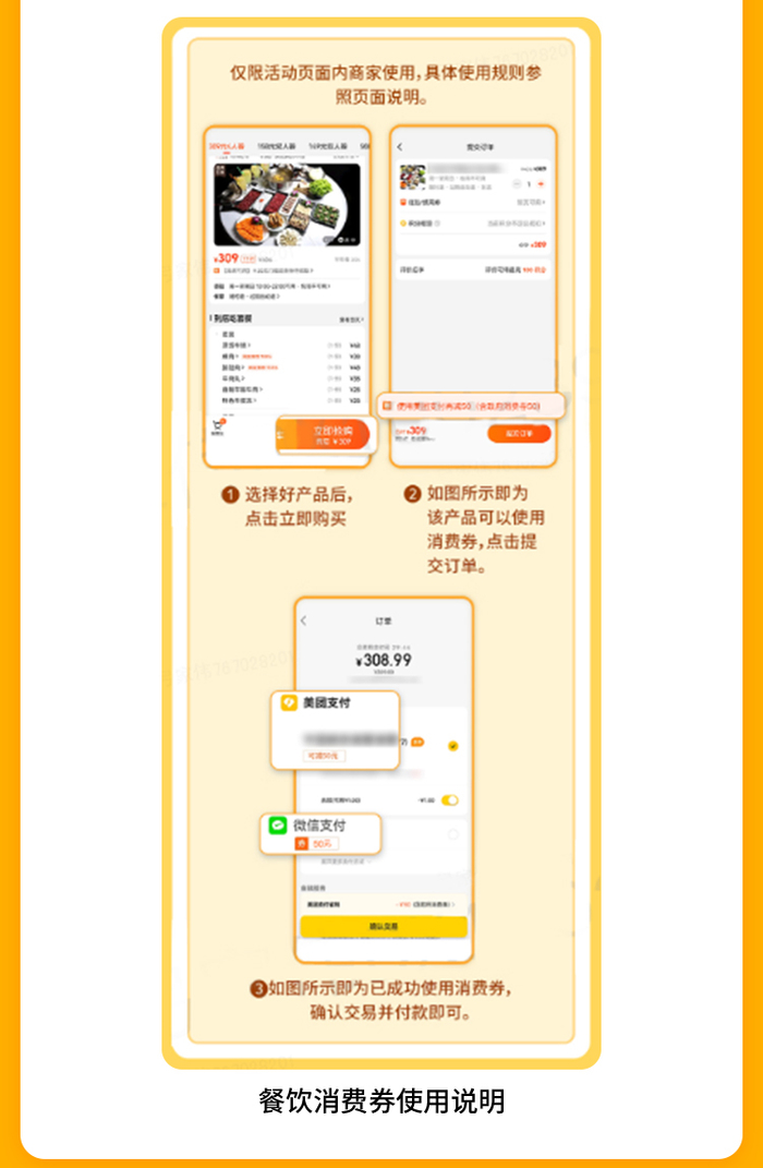 如消费者同时领取了美团平台优惠券及政府消费券,则需优先核销平台优惠券,剩余金额再使用政府消费券进行抵扣。