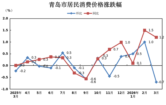 青岛日报社/观海新闻4月11日讯 国家统计局青岛调查队监测数据显示,2026年3月份,青岛市居民消费价格指数(CPI)同比上涨1.2%,其中,食品价格同比上涨1.4%,非食品价格同比上涨1.1%;消费品价格同比上涨2.2%,服务价格同比下降0.1%。3月份青岛市CPI环比下降0.7%。