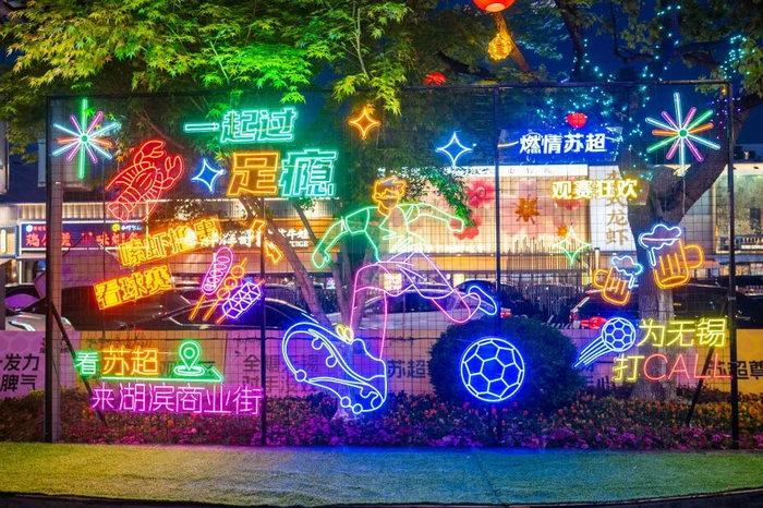 街道两侧的道旗全部换成了苏超主题;路口的大屏幕和沿街商家的小屏幕联动播放,滚动着苏超热梗和无锡队的精彩瞬间;你蚝烧烤外围、七欣天广场、东广场、李式龙虾周边,都搭起了半围挡式的主题氛围装置,球队口号、球员剪影、城市元素交织在一起,像是把整条街变成了一座巨大的球迷主题乐园。