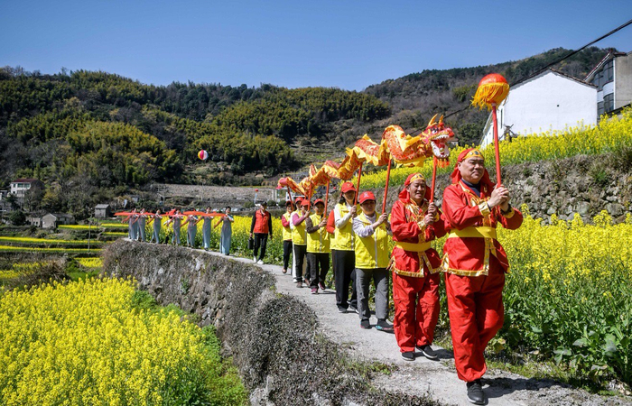 在嵊州市崇仁镇淡山村,微风中油菜花海翻涌,与缥缈的云雾、连绵的青山、古朴的民居相映成趣,勾勒出一幅生机盎然的春日画卷。以“千年古镇·花漾崇仁”为主题,一场别开生面的赏花系列活动拉开帷幕,当地精心编排腰鼓、汉服、手龙队巡游,搭配多场文艺演出,现场热闹非凡。