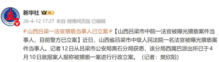 4月12日,新华社消息:近日,山西省吕梁市中级人民法院一名法官被曝光猥亵案件当事人。记者12日从吕梁市公安局离石分局获悉,该分局西属巴派出所已于4月10日就报案人报称被猥亵一案进行行政立案。