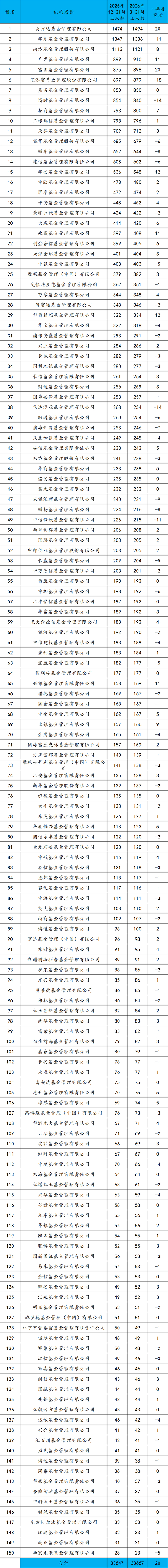 头部公司中,华夏基金管理有限公司员工人数从1347人减至1336人,减少11人。