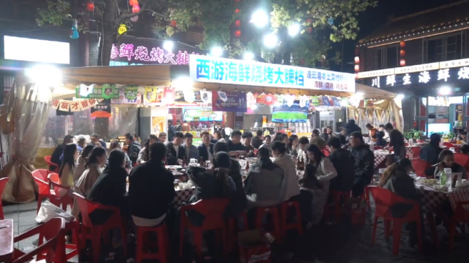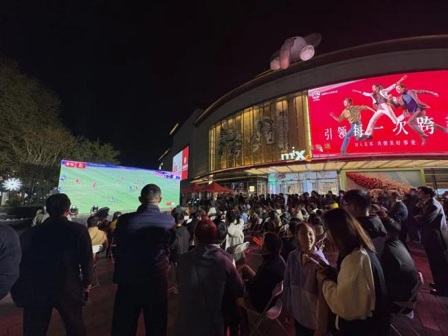 核心观赛区设在烧烤店外围,巨大的屏幕正对着露天座位区,食客们一边品尝美食,一边盯着比分变化;主力观赛点分布在广场上,大屏同步直播,周围的台阶、空地,甚至临街商铺的门口都有可以驻足观球的地方,而沿街的商铺但凡有屏幕的地方,无一例外都在播放着同一场比赛。在这里,你可以和整条街的一人一起看球、消费、社交……