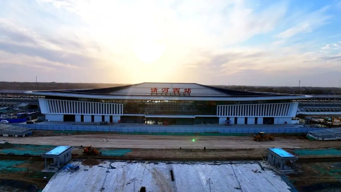 近日,清河西站站前的客运枢纽中心、旅客服务中心等配套工程主体结构完工,进入装饰装修与机电安装阶段。