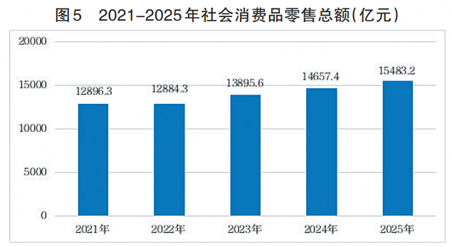 全年社会消费品零售总额15483.2亿元,比上年增长5.6%,增速居全国第2位。按经营地分,城镇消费品零售额13023.0亿元,增长6.0%;乡村消费品零售额2460.1亿元,增长3.6%。按消费类型分,商品零售额14091.3亿元,增长5.6%;餐饮收入1391.9亿元,增长5.6%。限额以上单位消费品零售额5369.0亿元,增长6.9%。