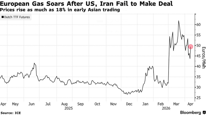 数据显示,自2月底美国和以色列首次袭击伊朗以来,欧洲天然气价格已上涨了逾50%。不过,当前价格较3月19日的盘中高点已回落约三分之一——当时伊朗对卡塔尔全球最大液化天然气出口厂发动袭击,导致天然气期货价格飙升。