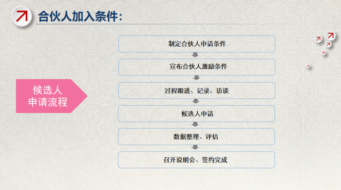 除了价值观方面的一致,对于合伙人的标准、责任、义务、权限应该在团队内达成共识。一方面是在合伙人选择时我们要慎重,另一方面对团队也是明确的信号,怎样才是一个合格的合伙人、如何从员工升级为合伙人,给所有人指明发展的路径和通道。
