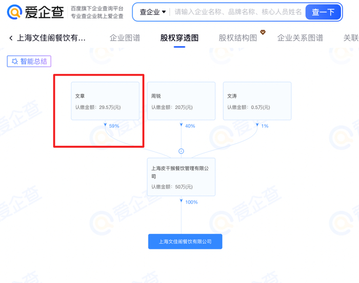 爱企查App显示,“八号院儿”面馆关联公司上海文佳阁餐饮有限公司成立于2025年11月,法定代表人为周锐,注册资本50万元人民币,经营范围为餐饮服务。股权穿透图显示,该公司由上海皮干猴餐饮管理有限公司全资持股,后者由文章持股59%。