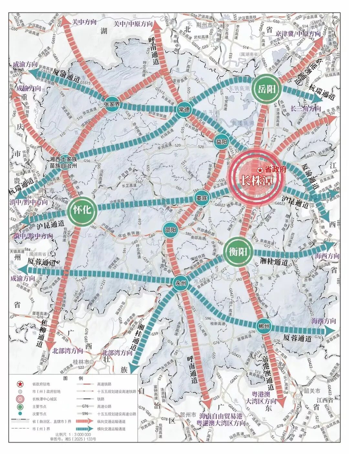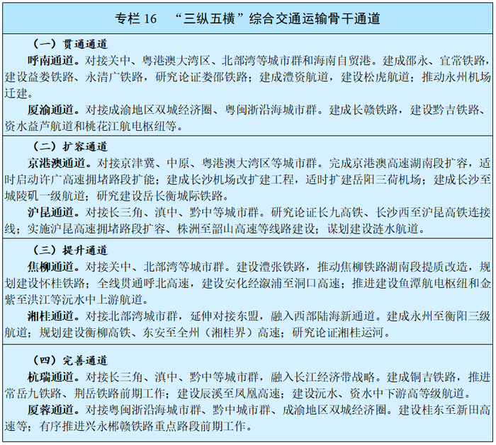 《纲要》提出:深度融入国家综合立体交通网主骨架布局,进一步提升骨干通道内畅外联能力。贯通呼南、厦渝通道,扩容京港澳、沪昆通道,提升焦柳、湘桂通道,完善杭瑞、厦蓉通道,提高向粤港澳、长三角、京津冀、成渝地区双城经济圈和关中、黔中、北部湾、海西区域等经济空间的通达能力。
