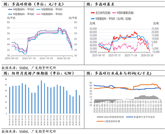 从价格和成本角度来看,多晶硅期价在供过于求的背景下,目前现货均价、低价产品和期货价格已经跌破单位成本,在向低成本生产企业的现金成本和前期低价区间发展。根据大全能源3月初的公告,其2025年4季度多晶硅单位现金成本为33.95元/公斤,单位成本为43.46元/公斤。协鑫科技3月底发布2025年年报,显示2025年颗粒硅平均现金制造成本(含研发)为25.12元/kg,较2024年的33.52元/kg下降25.1%。在今日多晶硅期货价格大幅上涨前,多晶硅主力合约跌至31000元/吨的低位,且较现货价格有2000元/吨以上的贴水,下游部分企业采购积极性增加,或有套保多头参与。但对于远月合约,涨停后已在38000元/吨左右,进一步买入积极性或将降低。