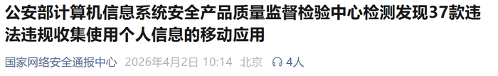 依据《网络安全法》《个人信息保护法》等法律法规,经公安部计算机信息系统安全产品质量监督检验中心检测,37款移动应用存在违法违规收集使用个人信息情况,具体通报如下: