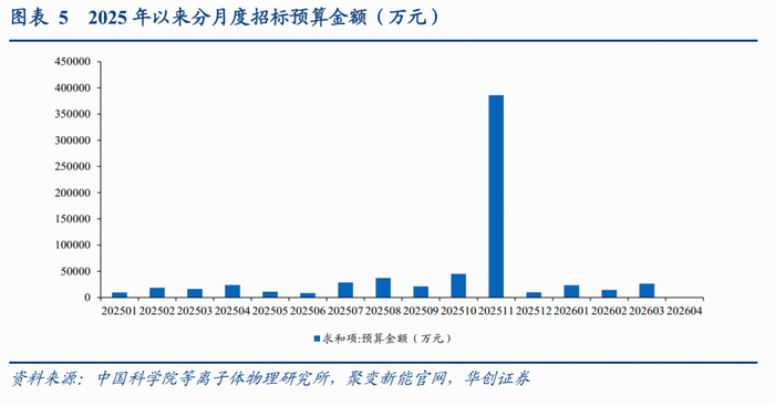 2025年初以来,根据我们统计的招标数据,2025年1月1日至2026年4月12日,BEST项目招标数量达到54个,招标预算金额达到21.88亿元,同期EAST、CRAFT项目的招标数据量仅为14、14个,招标预算金额分别为0.23、0.82亿元。其中,EAST项目多为升级维护,而BEST则涉及多个关键部件(磁体线圈、偏滤器、包层系统及第一壁)的招标,高价值量订单密集落地,表明行业或已逐步从密集招标步入密集中标的阶段,资本开支扩张逻辑持续验证。