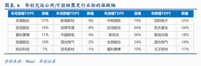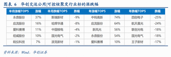 跌幅前五分别为:斯瑞新材(-9%)、哈焊华通(-8%)、中国核电(-4%)、国光电气(-2%)、派克新材(-1%)。