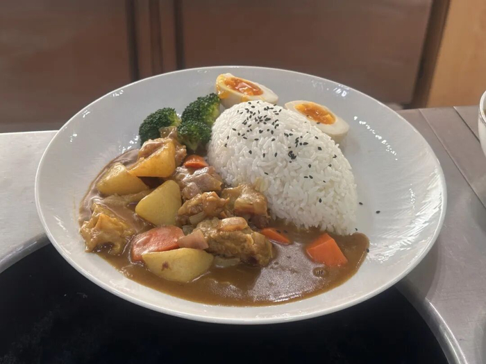 摆盘:米饭摆成圆润的形状,撒上芝麻。咖喱沿着米饭缓缓浇淋,旁边摆上焯过水的西兰花和一颗溏心蛋。